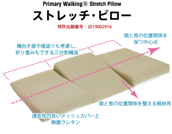 ストレッチピローは真ん中と左右、角度の位置を変える独自の設計と三分割構造により、寝返りをうったり横寝の際にも最適な頭と首の位置関係をキープします。